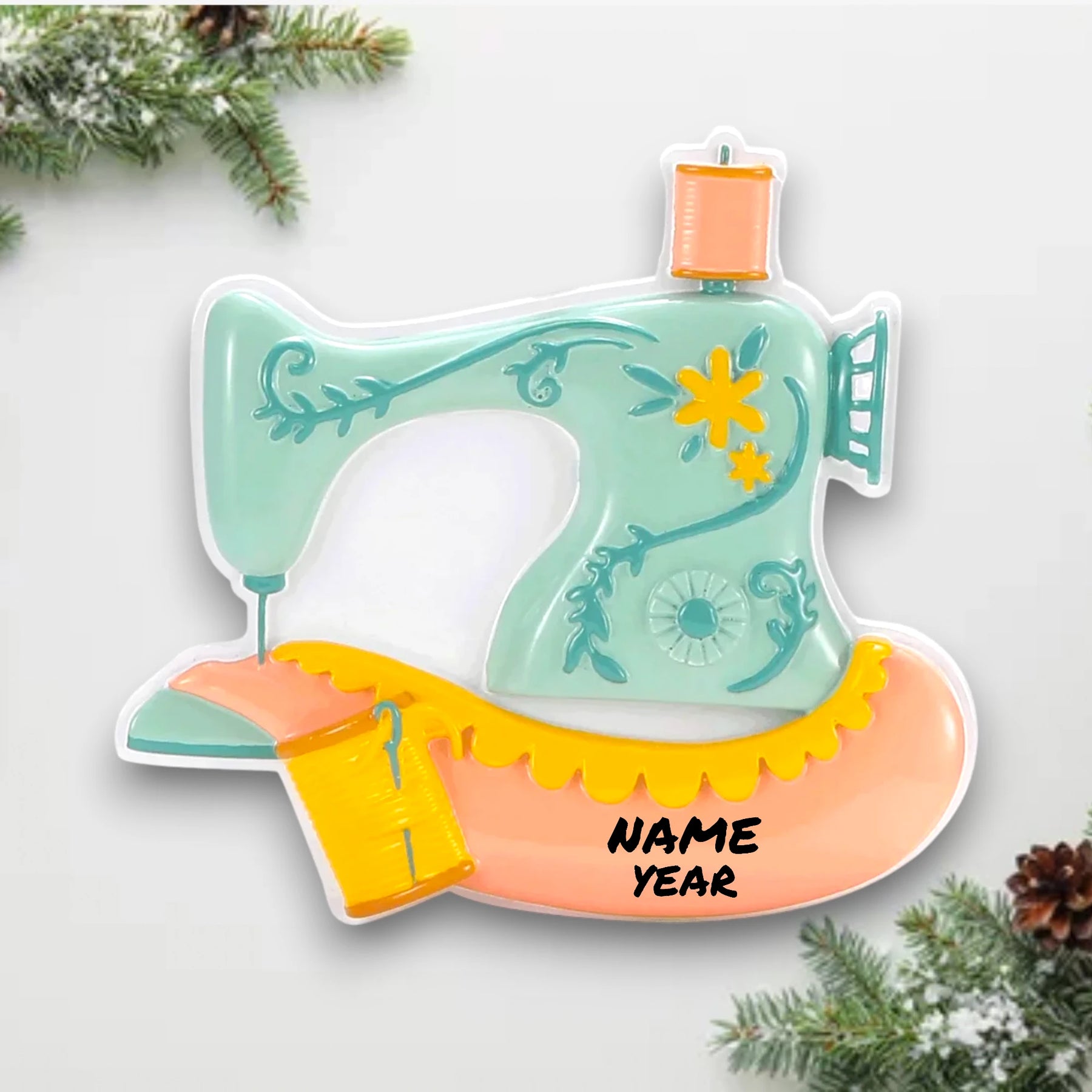 Personalized Vintage Sewing Machine Christmas Ornament with customizable name and year, featuring a retro-style sewing machine design.